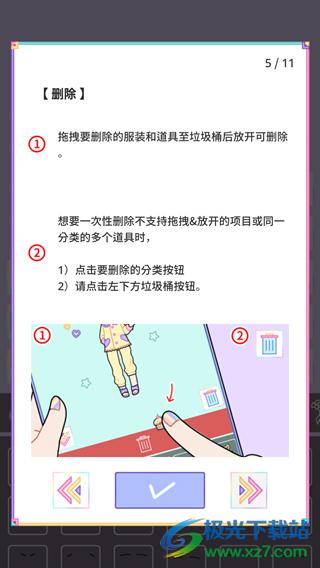 拖拽要删除的服装和道具至垃圾桶后放开可删除,想要一次性删除不支持拖拽&放开的项目或同一分类的多个道具时点击要删除的分类按钮,请点击左下方垃圾桶按钮。