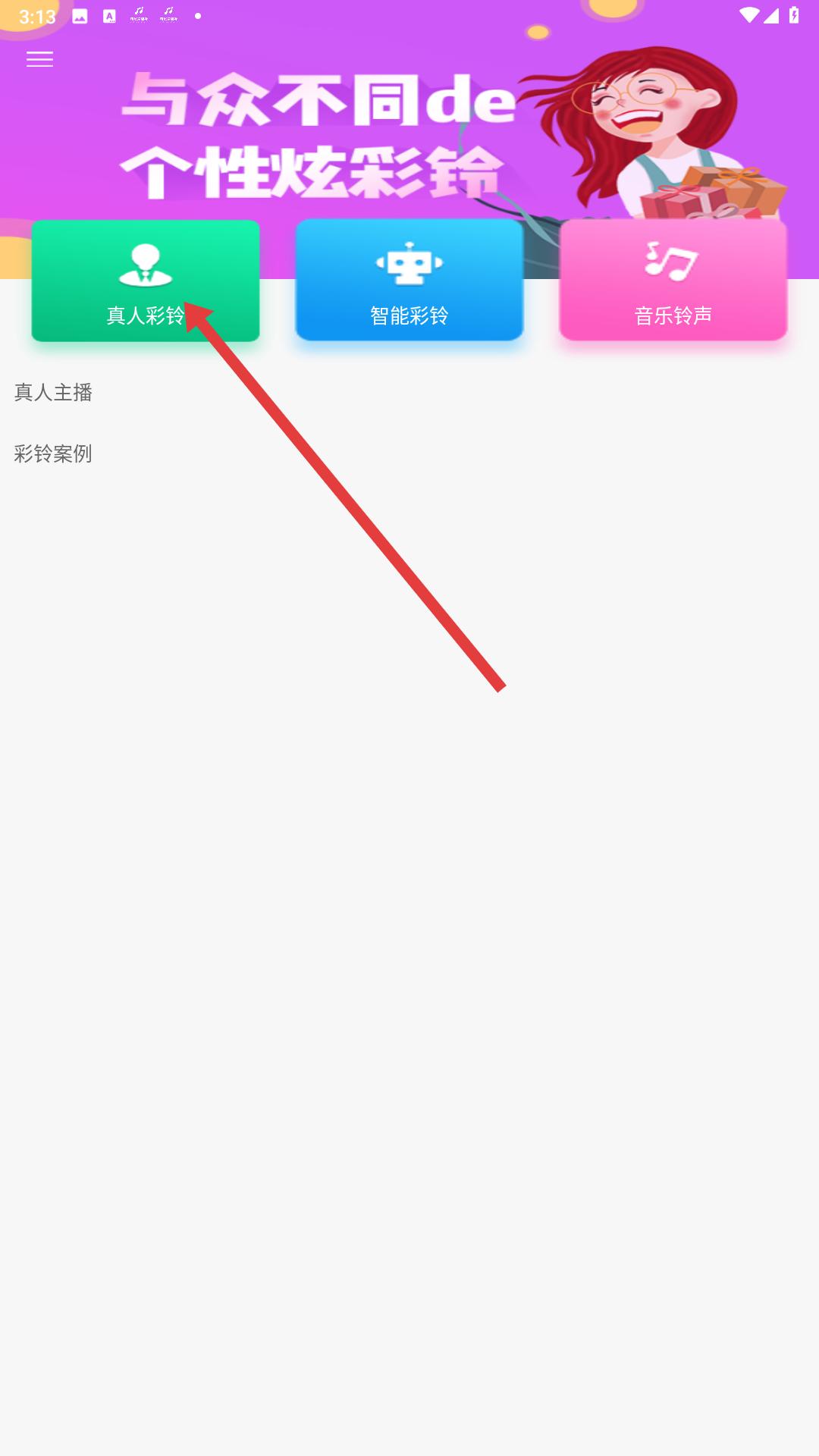 1、进入应用可见真人彩铃、智能彩铃、音乐铃声三大功能入口,选择真人彩铃可进入主播选择界面。