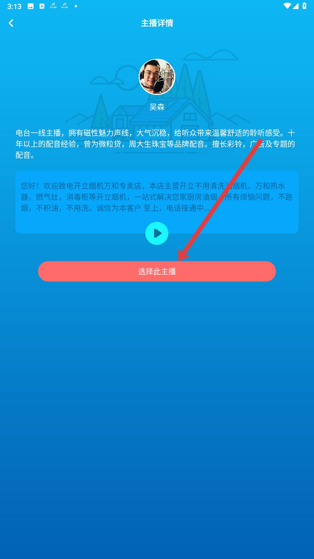 3、点击主播吴森进入详情页,可查看其配音经验和代表案例,试听彩铃样音后,点击选择此主播即可开始定制。