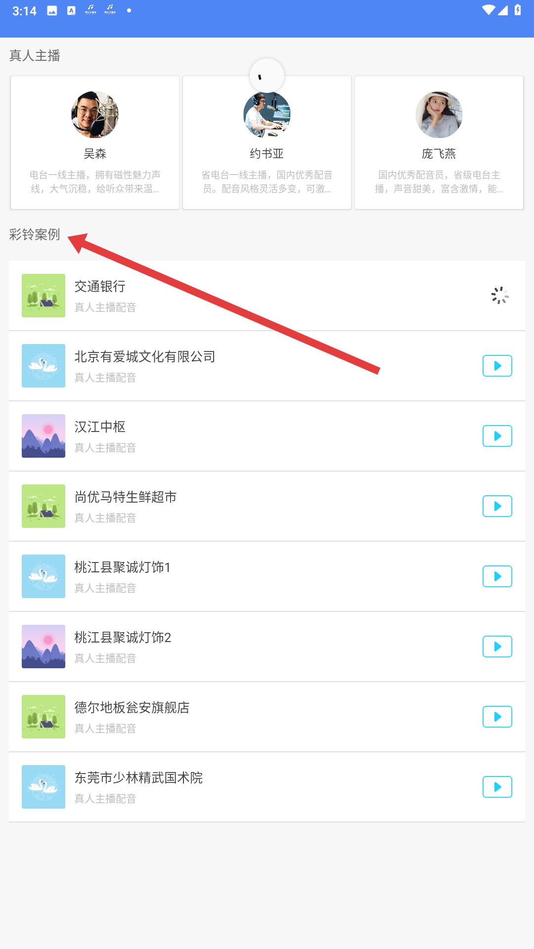 4、应用还提供彩铃案例展示,如交通银行、尚优马特生鲜超市等企业的真人主播配音案例,可参考这些案例来定制适合自己的彩铃。