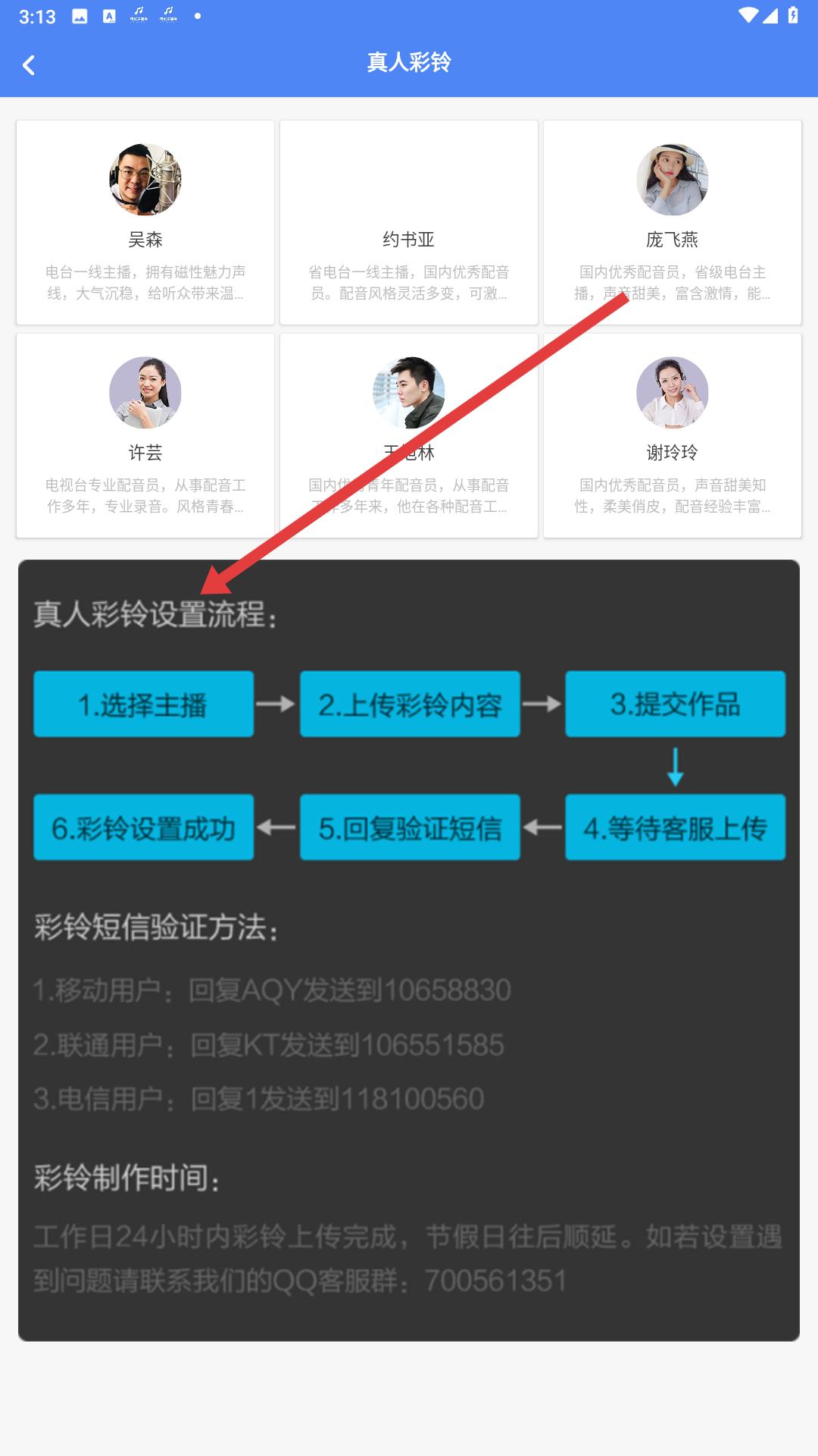 2、真人彩铃界面,有吴森、庞飞燕等多位主播可选,还展示了真人彩铃设置流程,从选择主播到最终设置成功共6步,清晰明了。