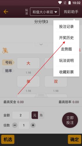 3、在彈出的菜單欄中點擊【開獎曆史】;