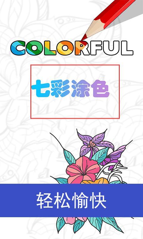1、呈现七彩涂色应用标识搭配花朵图案与轻松愉快标语引导进入涂色创作界面。