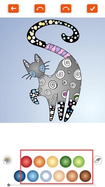 3、显示猫咪线稿涂色成果下方排列多色颜料选项支持选色为图案细节填充色彩。