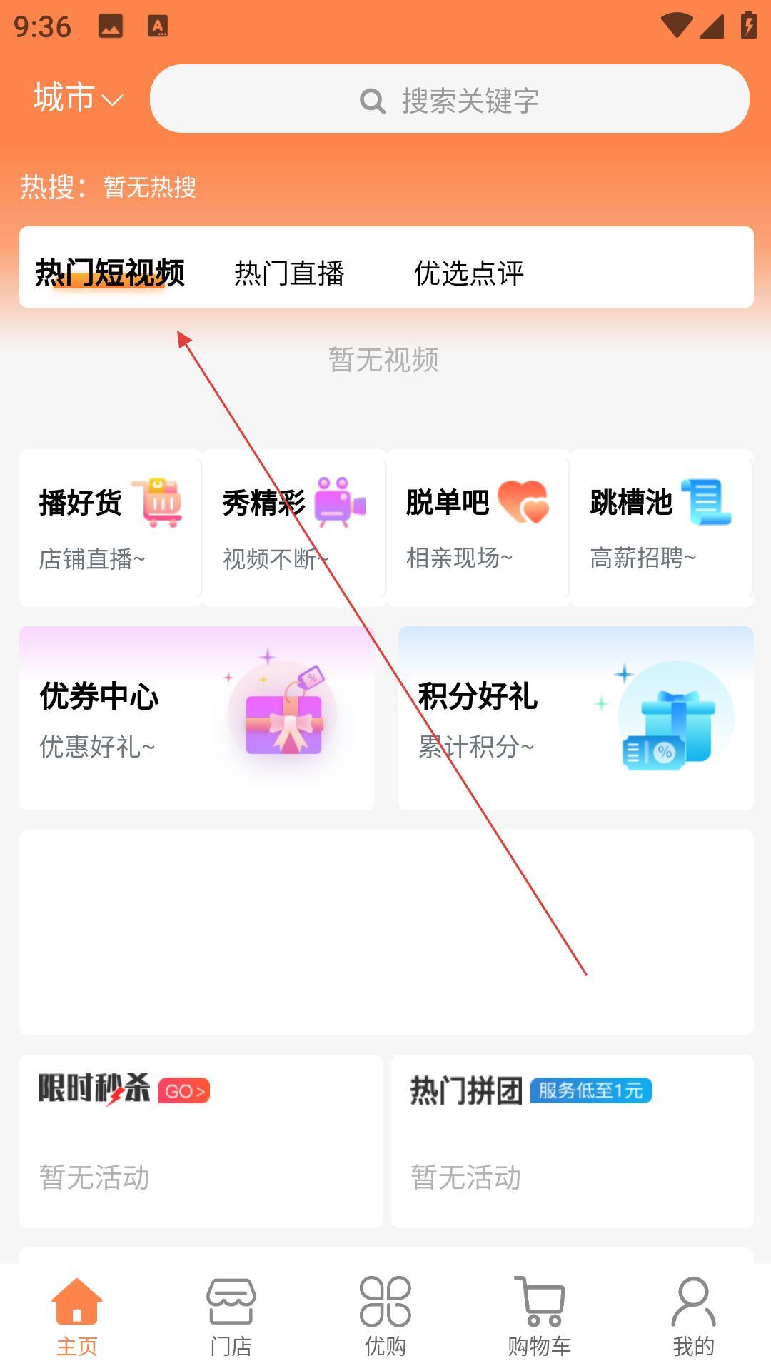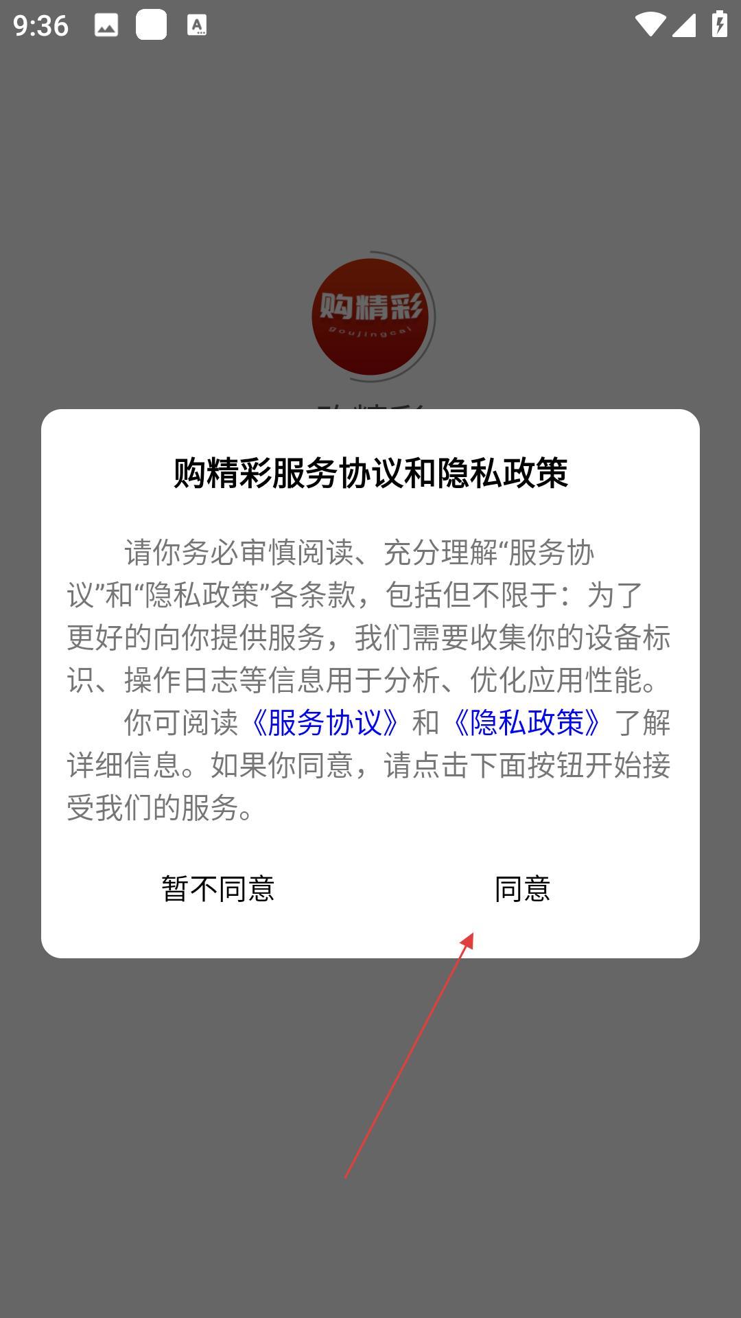 1、打开购精彩,点同意服务协议,进入首页,看热门短视频,逛优券中心,参与限时秒杀,体验购物。