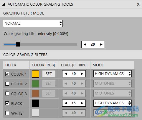 使用自动机,您可以使用其具有不同构图模型的自动颜色分级工具来设置 COLOR 1/2/3 滤镜。模式设置允许您更改彩色滤镜与处理后图像的交互方式,而黑白滤镜则为编辑的照片添加曝光和对比度。MODE 设置控制图像图层和颜色分级工具图层之间的混合模式。