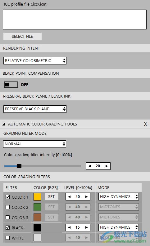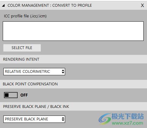 使用颜色转换为配置文件工具,您可以选择ICC配置文件,它定义了目标颜色空间(RGB,CMYK,灰度)。您还可以设置渲染方法和黑点补偿的用法。Automata Pro将ICC配置文件嵌入到保存的照片中。