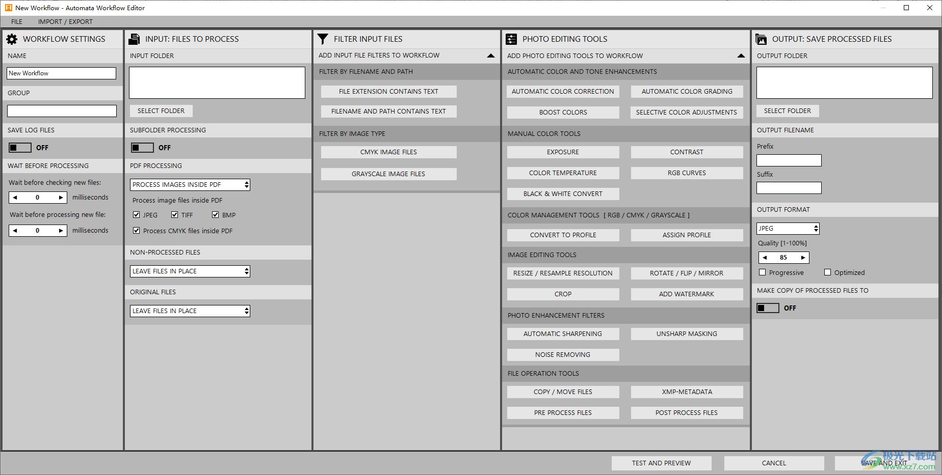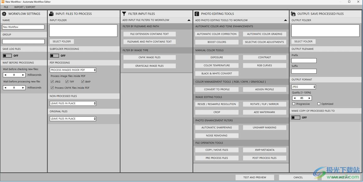6、新工作流程界面,工作流设置、输入:要处理的文件、筛选输入文件、照片编辑工具、输出:保存已处理的文件