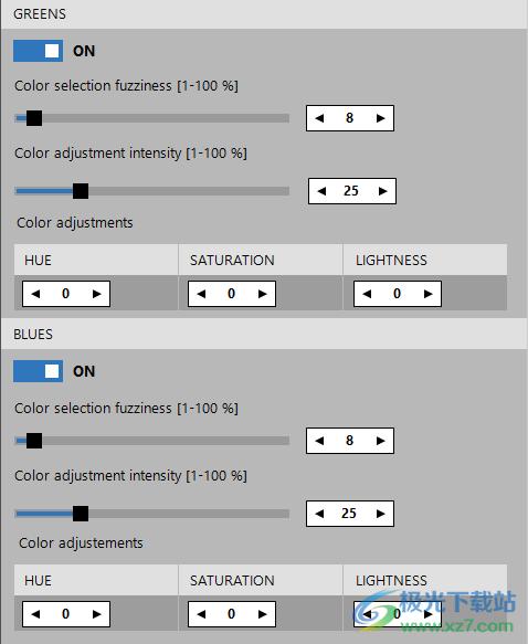 您可以使用选择性颜色调整工具设置所选颜色的色相/饱和度/亮度值。您可以选择肤色、蓝色和绿色的特定设置。颜色选择是用模糊值进行的。强度值调整颜色值在选定区域下混合颜色的方式。选择性颜色调整设置将在颜色分级工具之后应用于处理后的照片