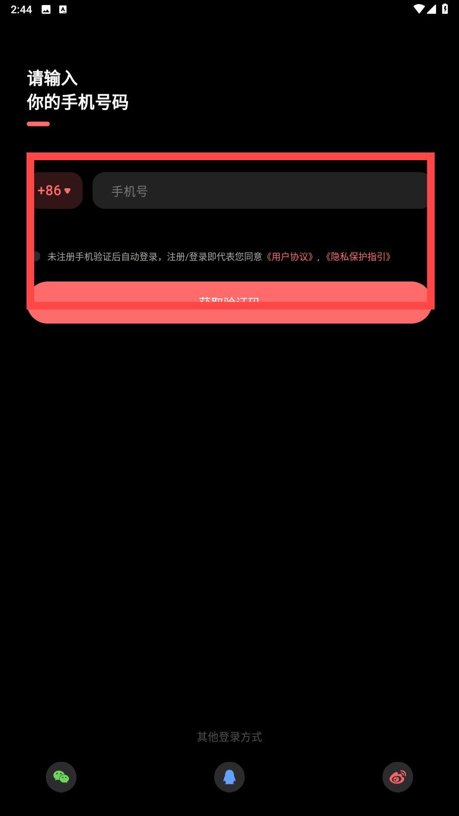 3、软件在这时会弹出登录界面,输入手机号,即可登录,如若没有账号,注册完毕即可登录使用软件的功能了。