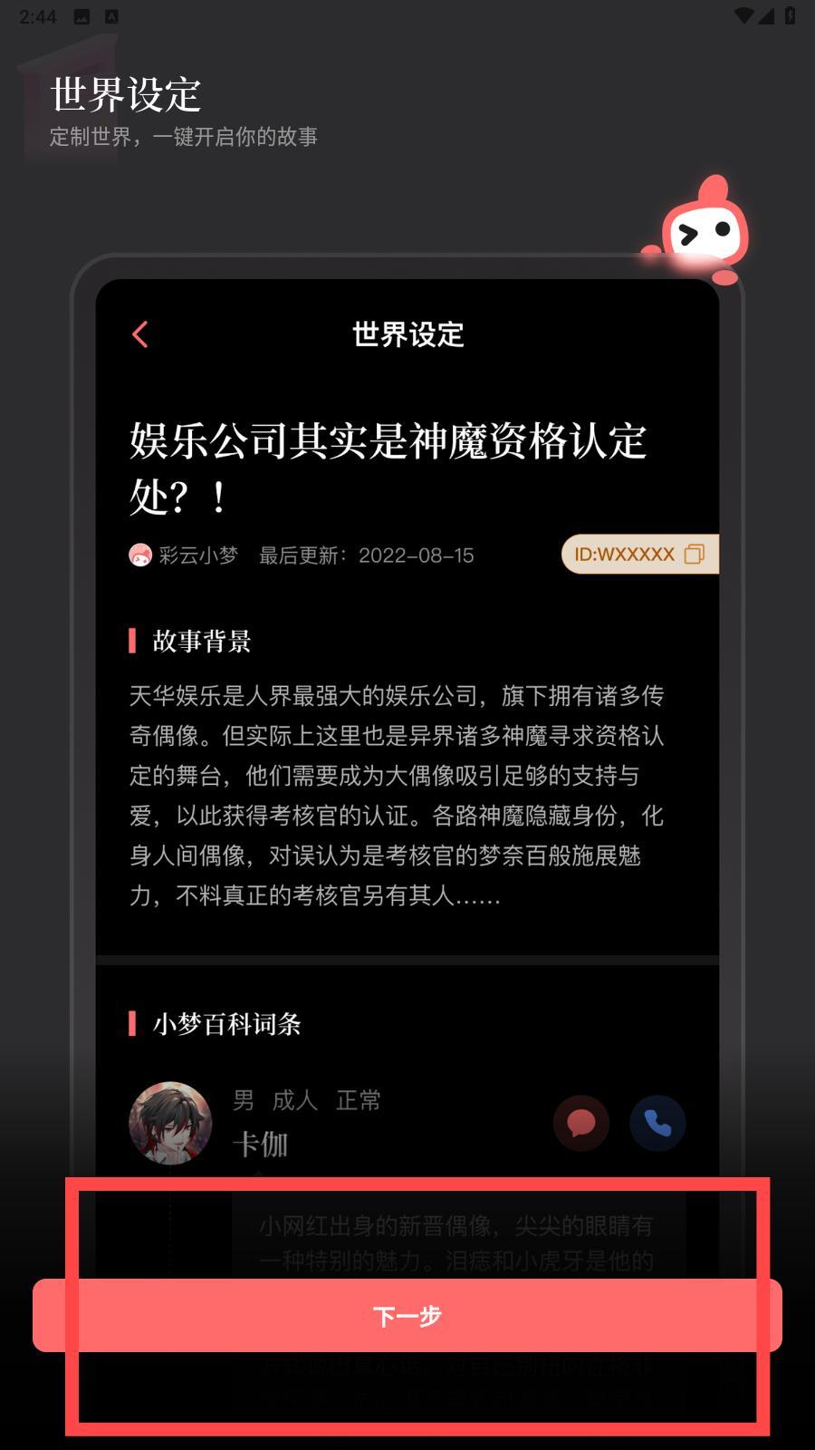 新增了世界设定功能。点击地球图标开启世界设定功能,塑造专属于你的世界。你可以创建普通词条和人物词条,还可以创建人物之间的关系。你也可以添加一段背景故事,帮助小梦更好地了解你的世界。