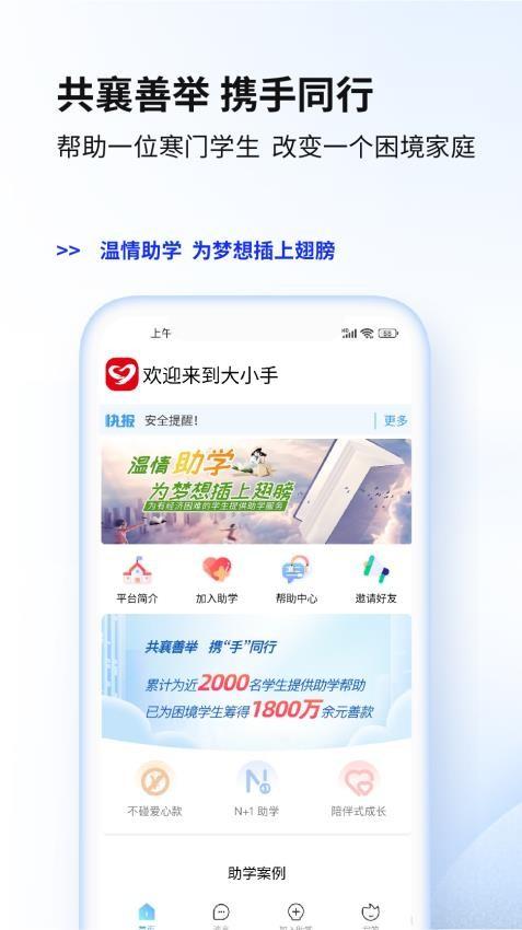 大小手APP手机版是一款为用户提供助学服务的软件,让更多爱心人士可以通过平台来加入到助学团队中为贫困学生提供助学帮助,同时贫困学生可以通过平台来提交真实资料申请助学,从而获取助学爱心人士的助学帮助,还可以通过助学群聊的方式来让爱心人士可以直接在线与受助方取得沟通联系,便捷双方在线沟通助学的相关事宜使用,软件中将每位贫困学生的详情状况进行了全面展示,让爱心人士能够直观的了解到贫困学生的助学需求以及贫困情况,此外,还将助学成功的案例进行了在线展示,让大家可以查看了解各种助学案例信息,有需要的用户就快来下载大小手官网版软件进行使用吧!